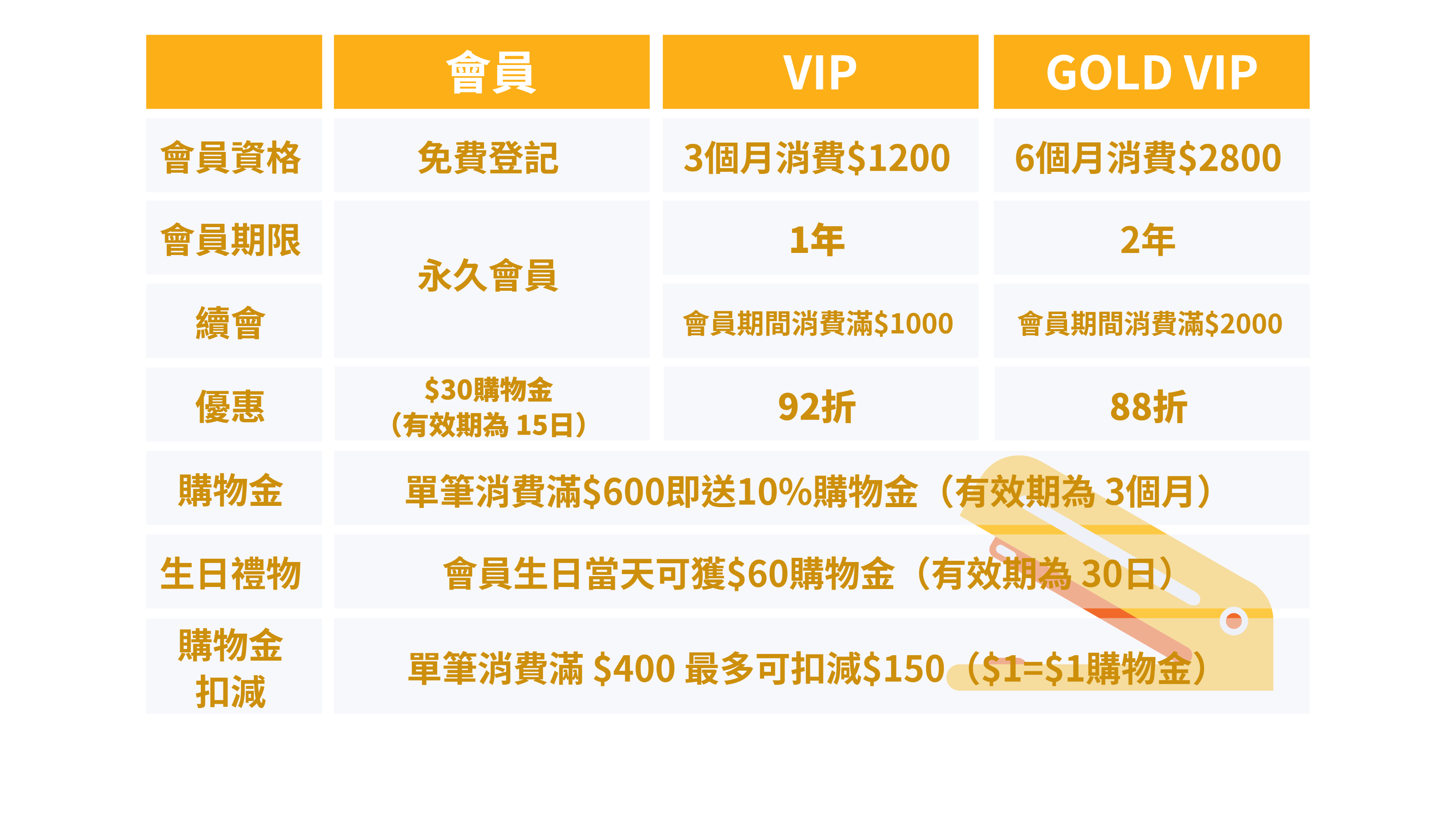 VIP - 於6個月內消費滿$2800即可升級成為Gold VIP,為期兩年。年期內消費滿$2000即可自動延長兩年。