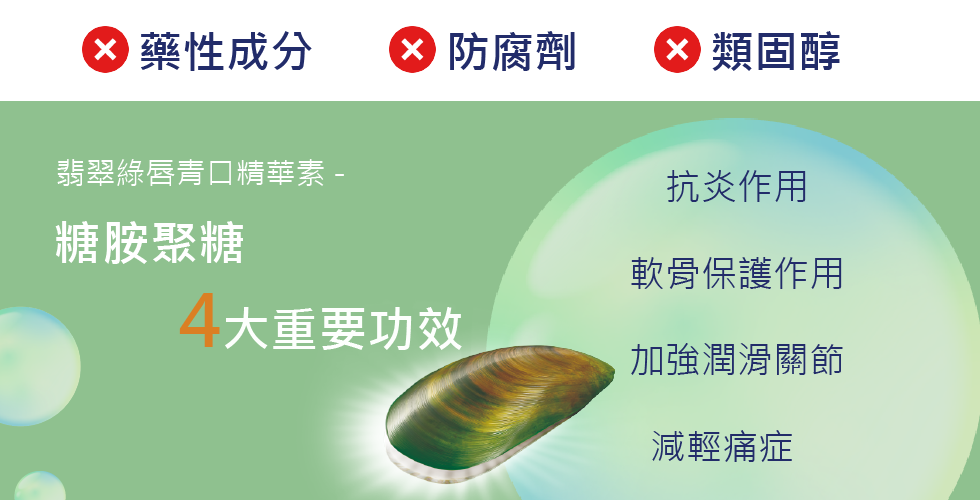 活性成分翡翠綠唇青口精華素--蘊含天然糖胺聚糖(GAG), 有抗炎和潤滑關節作用。